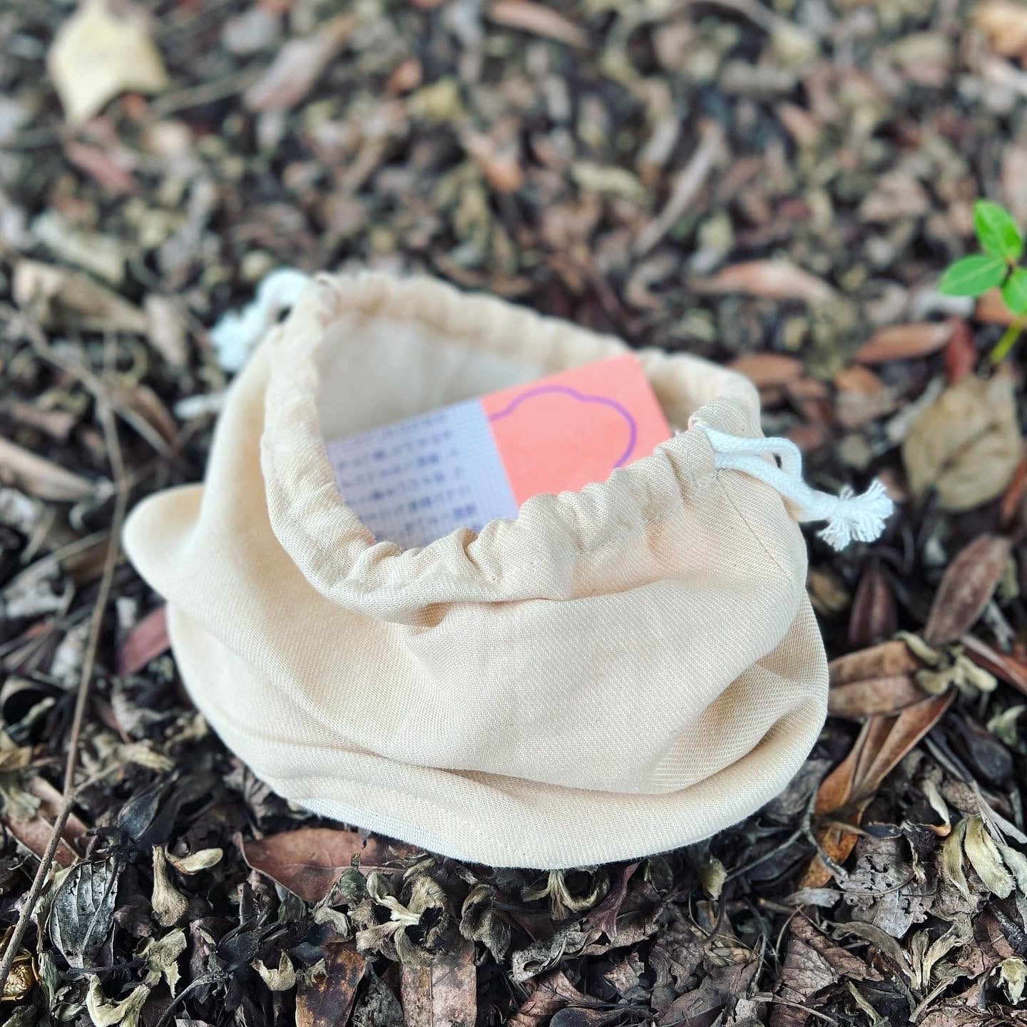 小国杉から特殊な技術でセルロースを抽出して撚った糸を、麻や綿などの自然素材と織りあわせ、きんちゃくに仕立てました。